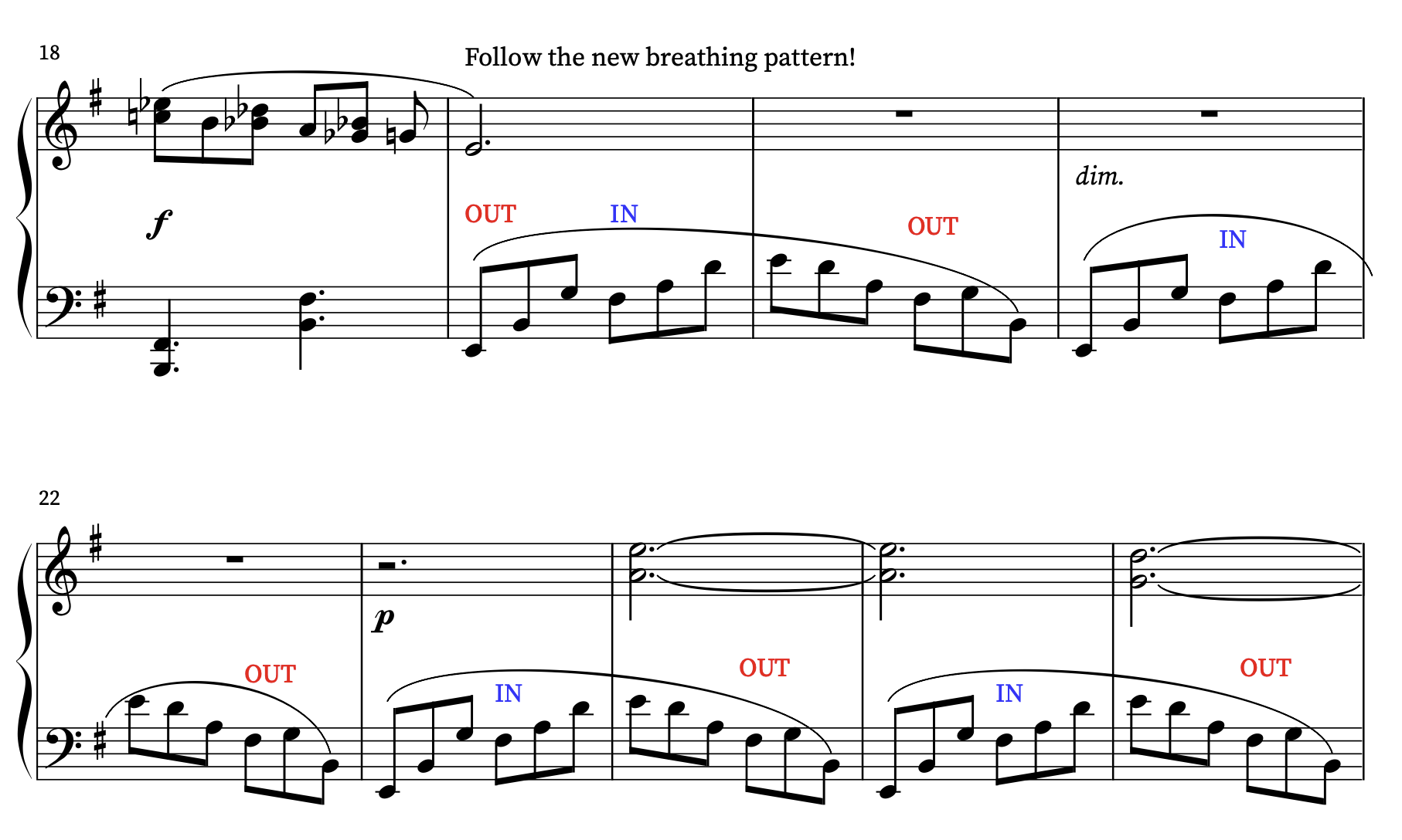 The Six Rhythmic Breathing Etudes are an exploration of the rhythm and pace of breath in playing. These pieces include an introduction with instructions, a copy of the score with suggested breathing patterns, questions for reflection, and a Feldenkrais Awareness Through Movement® lesson on rhythmic breathing. The learning intention is to expand awareness of the breath during playing. It is often difficult to attend to the many details of the music as well as our breath, and this process aims to bridge that gap, reuniting the mind and body for optimal performance.